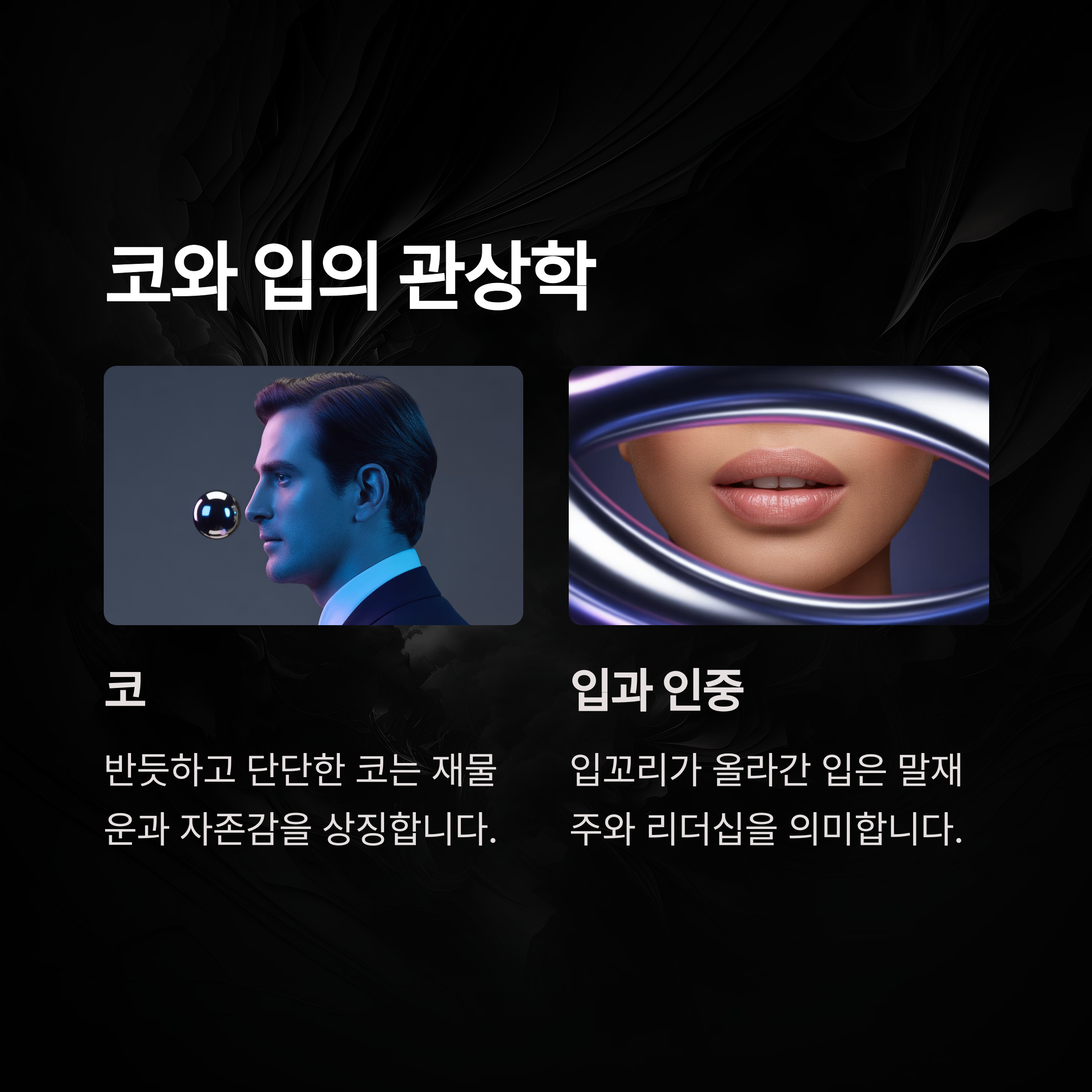 입꼬리가 자연스럽게 올라간 사람은 말에 힘이 있고 신뢰를 주는 리더형입니다. 입술은 건조하지 않고 적당한 두께가 좋으며, 두툼하고 균형 잡혀 있으면 말솜씨가 좋고 재물을 끌어오는 힘이 강하다고 봅니다. 인중이 깊고 선명할수록 건강과 자손운이 좋다고 여겨집니다.