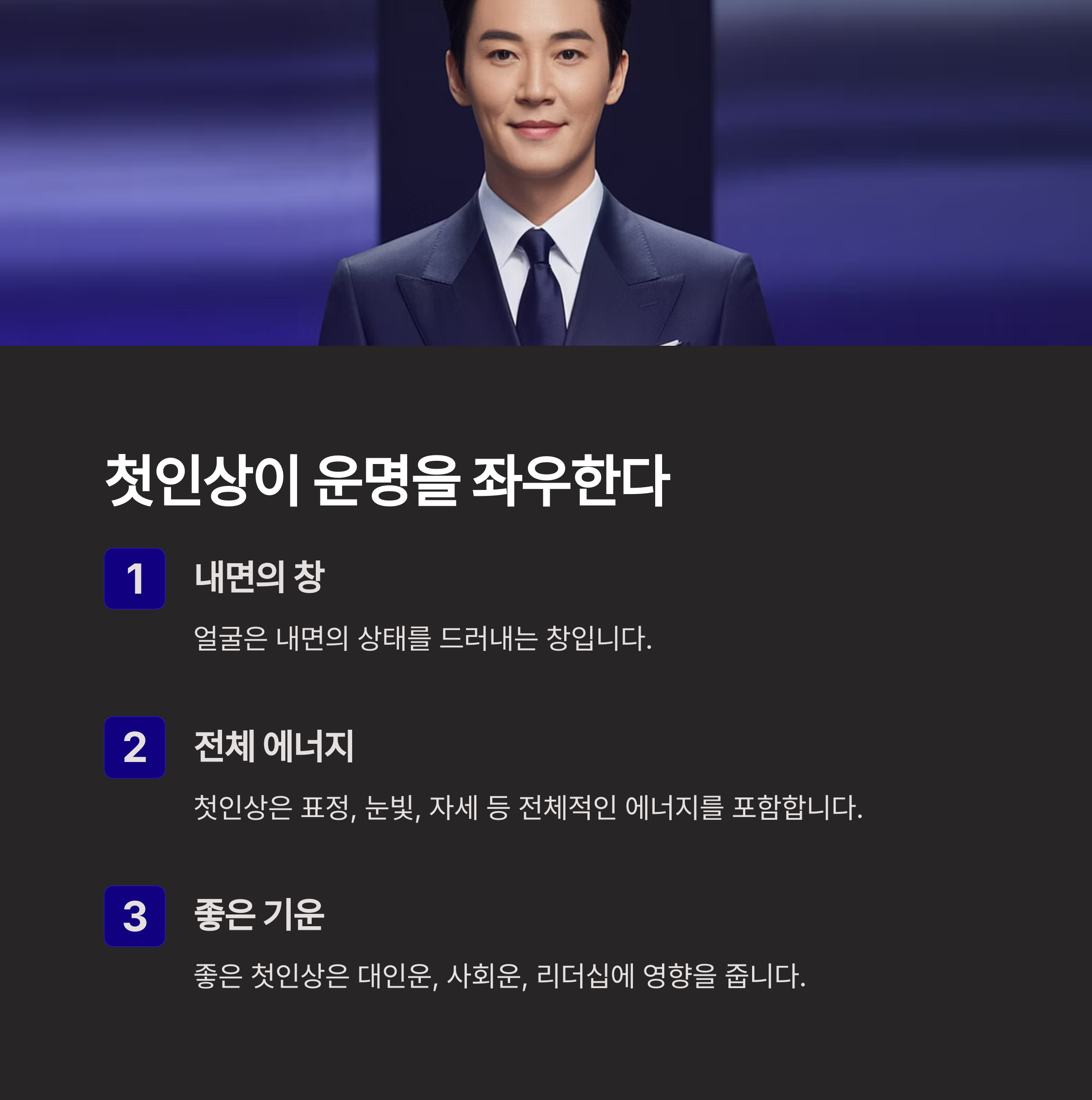 📌 좋은 첫인상은 곧 좋은 기운(氣運)을 의미하며, 그 사람의 대인 운, 사회운, 리더십, 인기운 등을 가늠할 수 있다고 봅니다. 실제 채용 면접이나 소개팅 자리에서 관상가들이 먼저 보는 것이 눈이나 코보다도 ‘전체적인 기운’과 첫 3초의 표정인 것도 이 때문입니다.