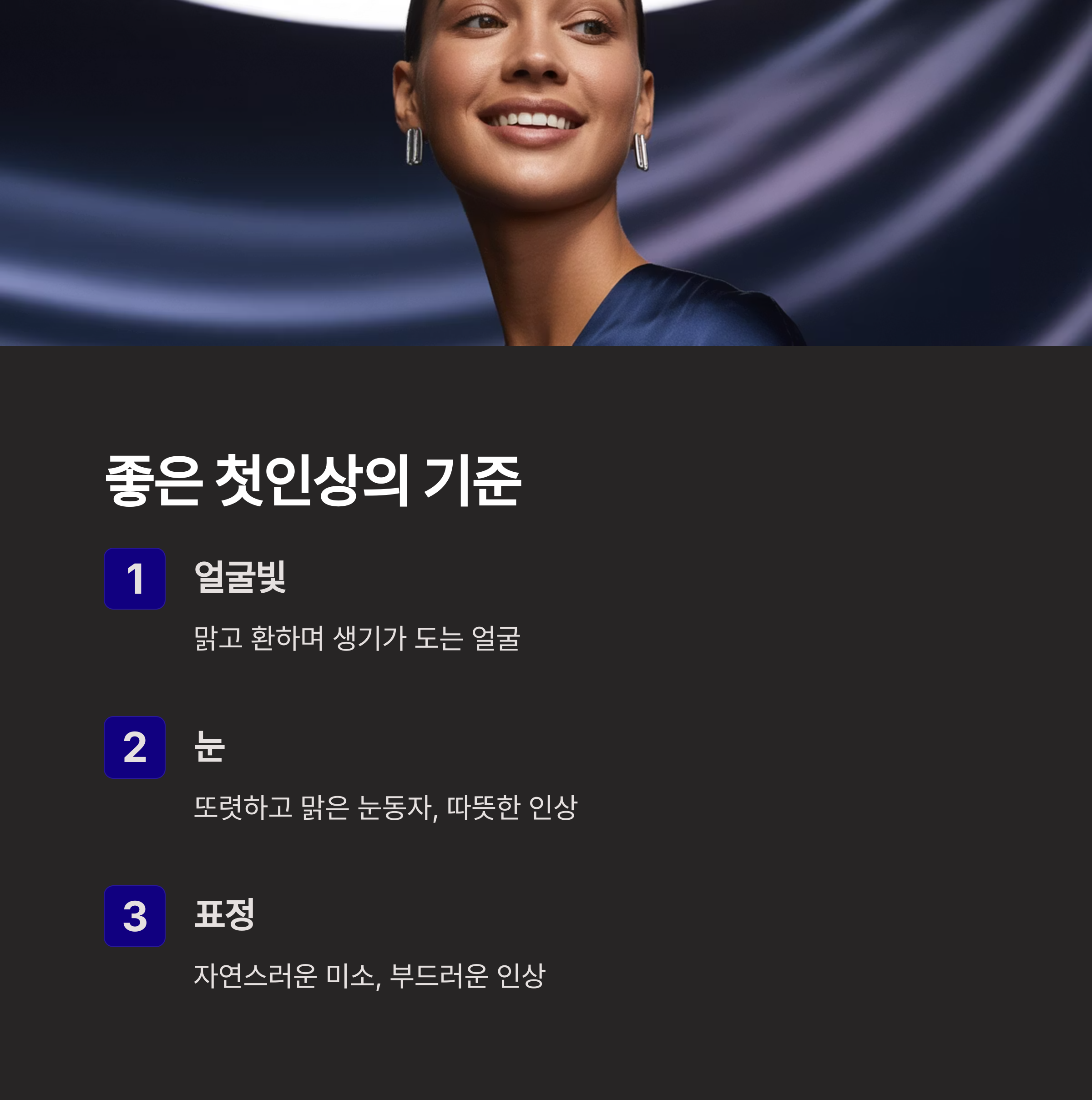 관상에서 말하는 '좋은 첫인상'은 다음 조건을 기준으로 평가됩니다. 중요한 것은 얼굴의 생김새보다 표정, 에너지, 생기가 더 핵심이라는 점입니다.