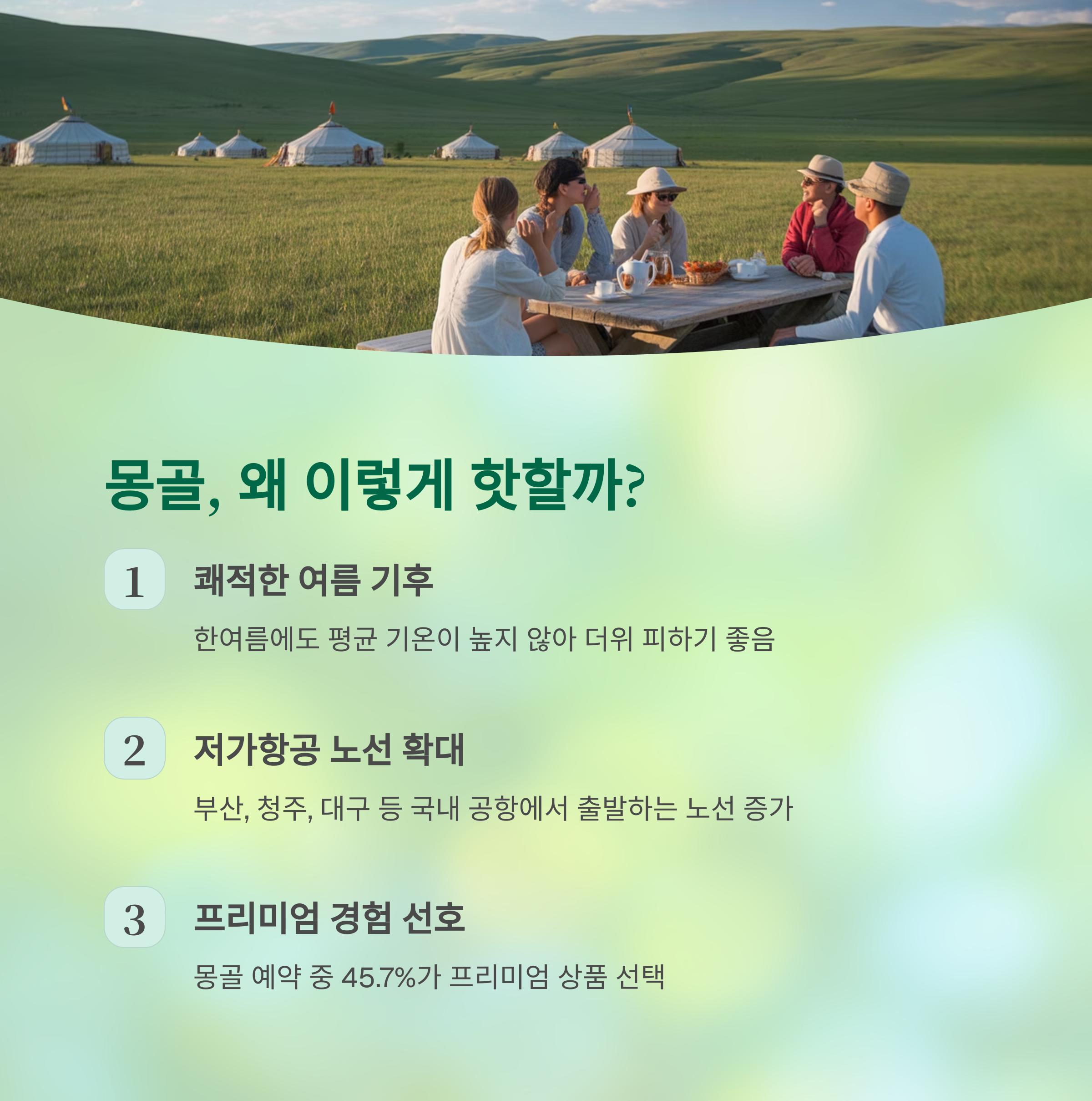 또한, 새로운 경험을 추구하는 소비자 트렌드 변화도 몽골의 인기에 한몫했습니다. 설문조사에 따르면 관광객들은 색다른 경험을 제공하는 여행지를 선호하며, 실제로 몽골 전체 예약 중 프리미엄 상품이 45.7%를 차지할 정도로 몽골 여행에 대한 기대와 만족도가 높게 나타났습니다.