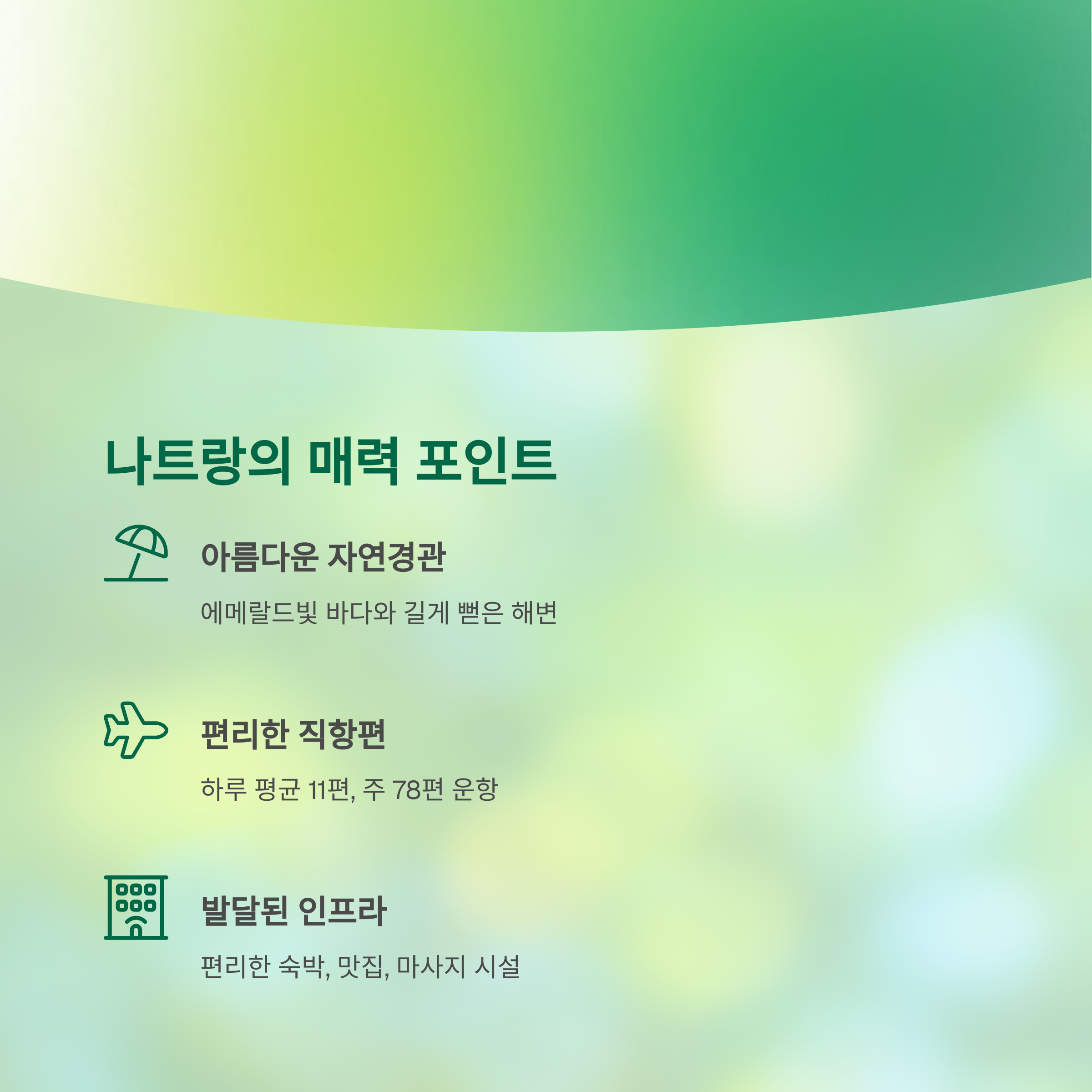 - 편리한 직항 편: 한국에서는 현재 서울-냐짱, 부산-냐짱, 대구-냐짱 운항 중이며, 운항 편수는 점차 늘어나고 있습니다. 통계에 따르면 한국과 냐짱을 연결하는 항공편은 주당 약 78편, 하루 평균 11편으로, 베트남과 한국을 대표하는 8~9개 항공사가 운항하고 있어 접근성이 매우 뛰어납니다.