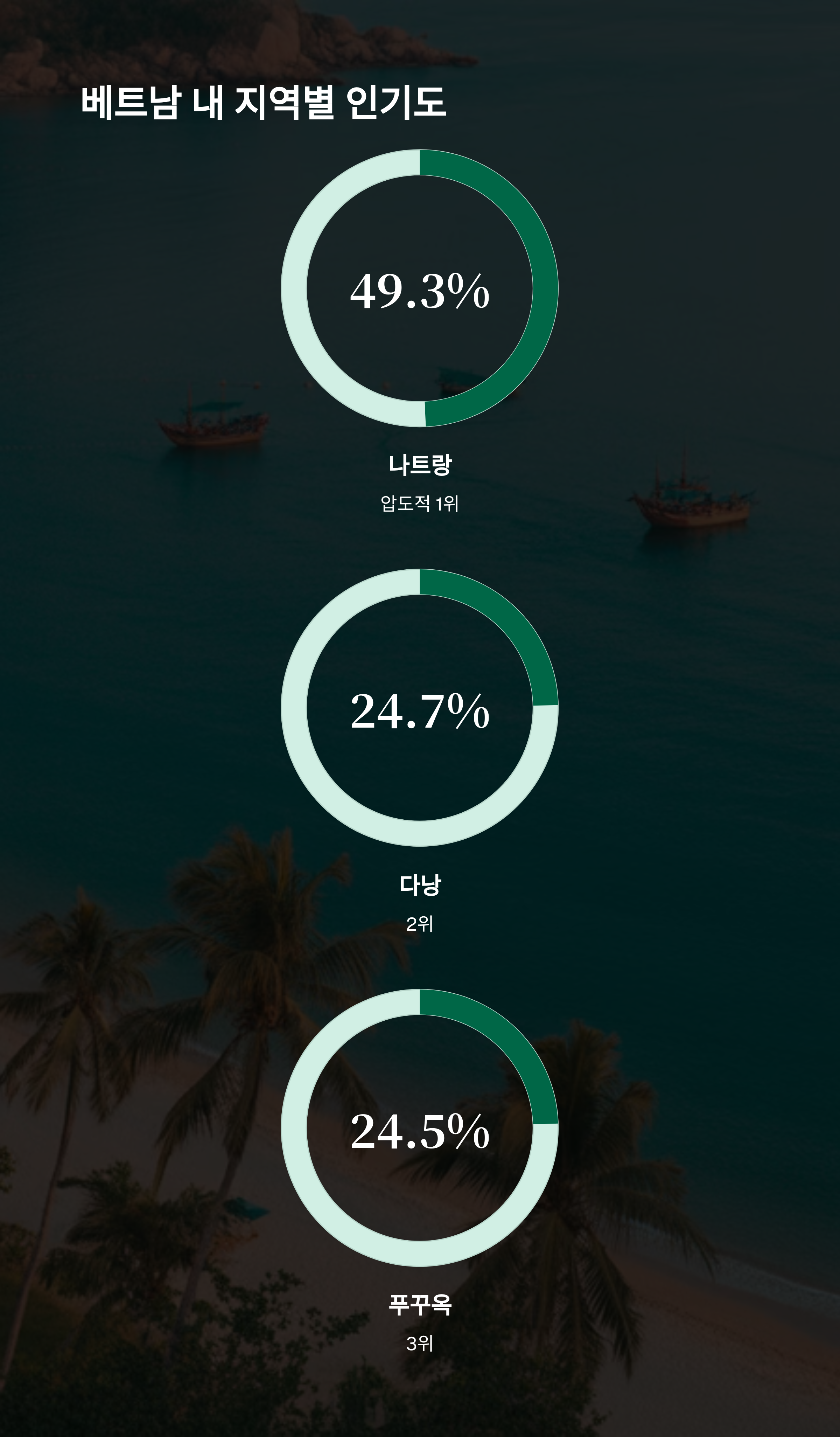 지역별 예약률을 살펴보면, 냐짱이 49.3%로 압도적인 1위를 차지했으며, 다낭(24.7%)과 푸꾸옥(24.5%)이 그 뒤를 이었습니다. 냐짱이 이렇게 뜨거운 사랑을 받는 이유는 무엇일까요?