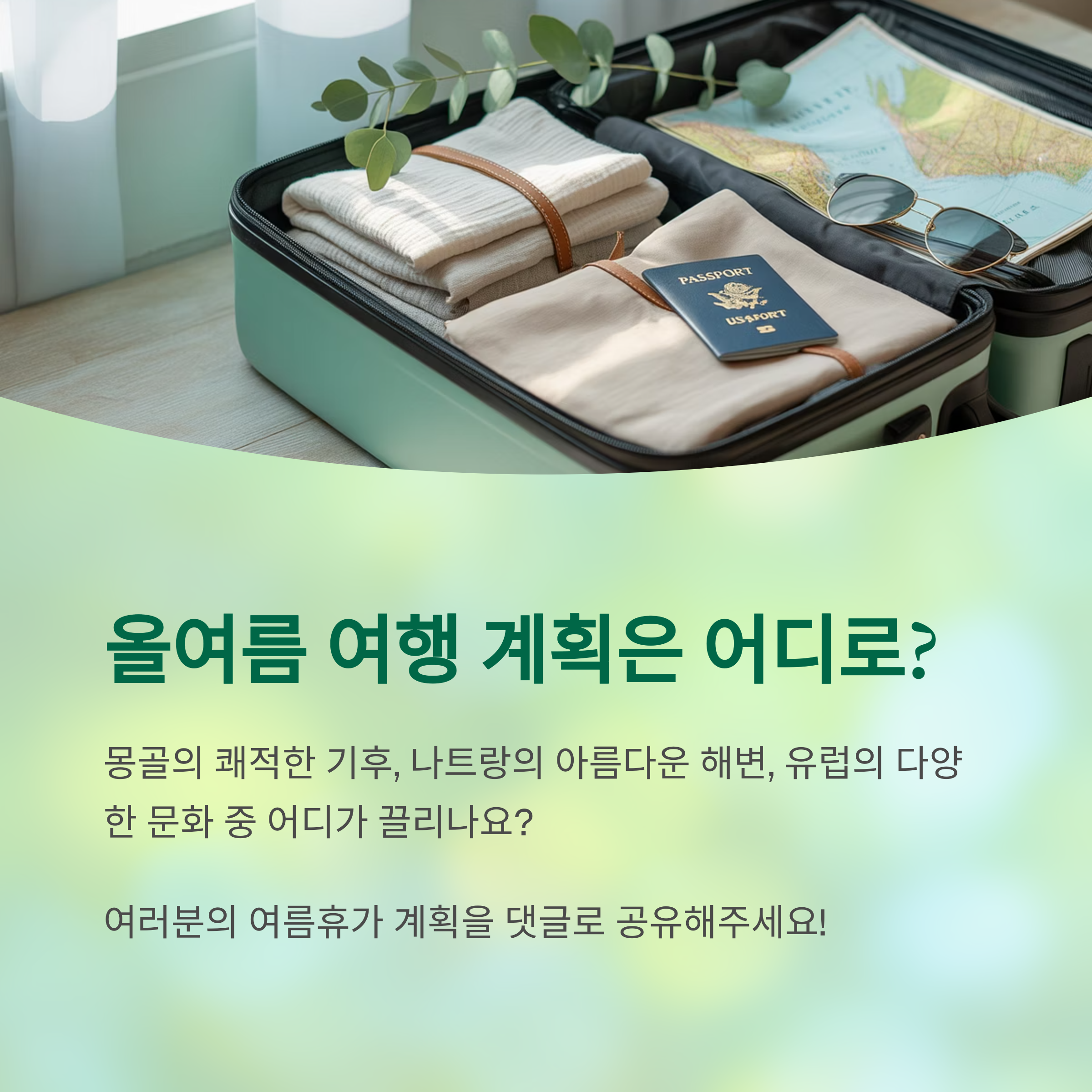앞으로도 교원투어는 한국 관광객들의 다양한 여행 트렌드에 맞춰 차별화된 상품을 지속적으로 선보일 계획이라고 하니, 다음 여행도 기대가 됩니다! 몽골과 베트남 냐짱을 포함해 올여름 인기 여행지 정보를 참고하셔서 즐겁고 의미 있는 여름휴가 보내시길 바랍니다.