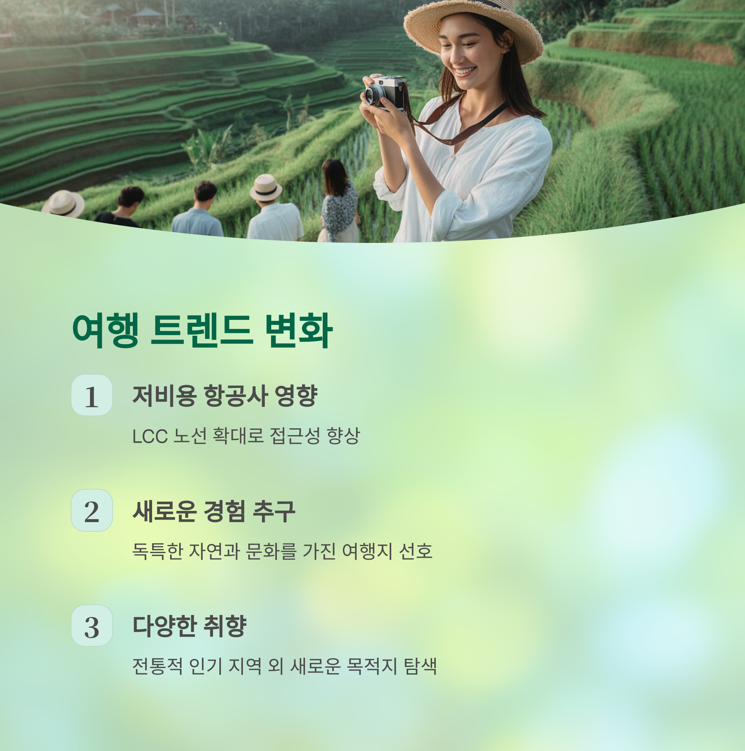 Q3: 저신용 항공사(LCC)가 인기 여행지 선정에 큰 영향을 미쳤나요? A3: 네, 보고서 분석 결과 저비용 항공사(LCC)를 중심으로 몽골과 베트남으로 가는 노선이 늘어나면서 관광객들이 이들 국가에 더 쉽게 접근할 수 있게 되었고, 이는 인기 여행지 선정에 큰 영향을 미 미친 것으로 나타났습니다.