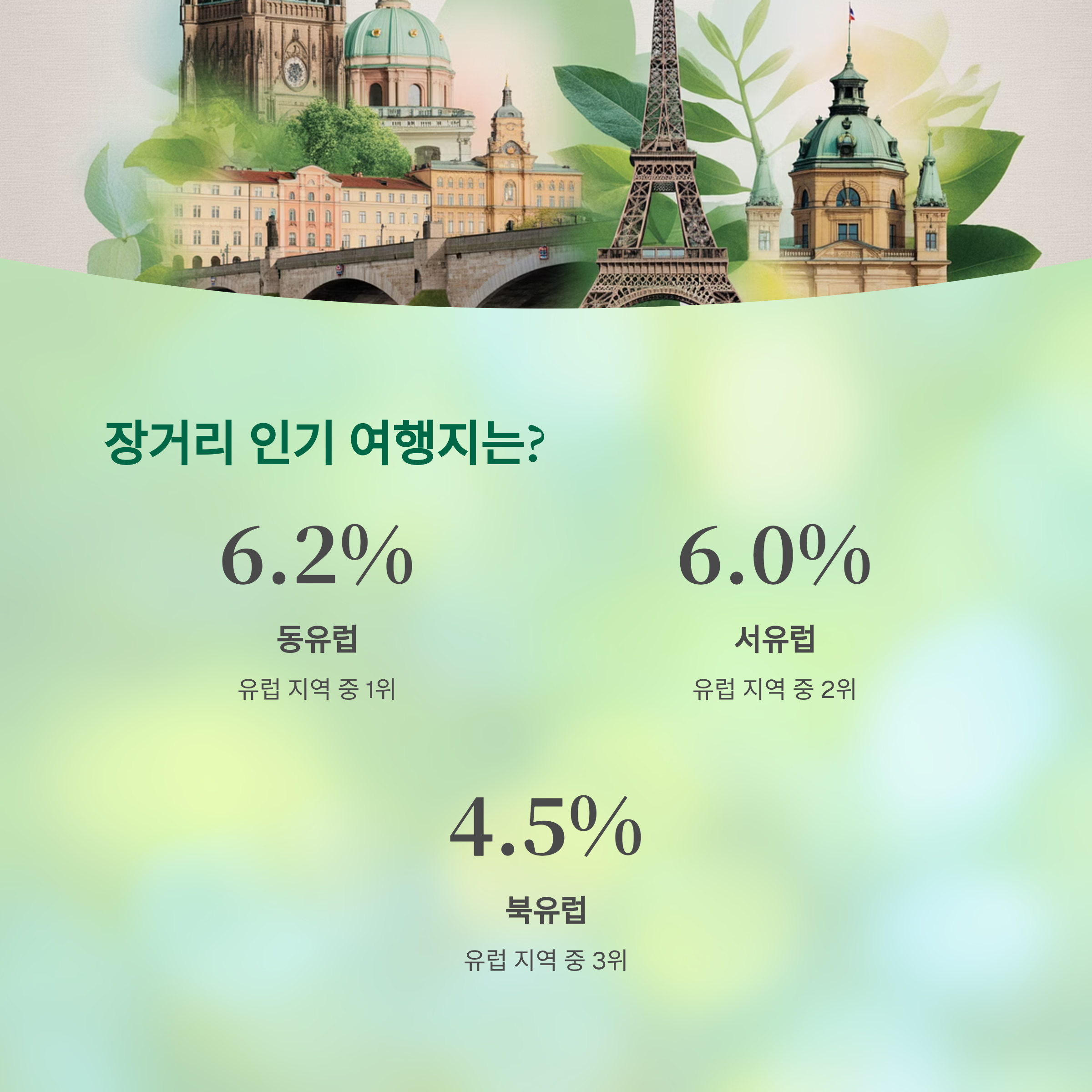 장거리 여행지 중에서는 유럽이 가장 인기 있는 지역으로 나타났습니다. 동유럽(6.2%), 서유럽(6.0%), 북유럽(4.5%), 남유럽(3.6%)이 6위부터 9위를 차지했습니다. 여름에도 시원한 기후를 자랑하는 호주는 10위를 기록하며 장거리 여행지로서의 매력을 보여주었습니다.