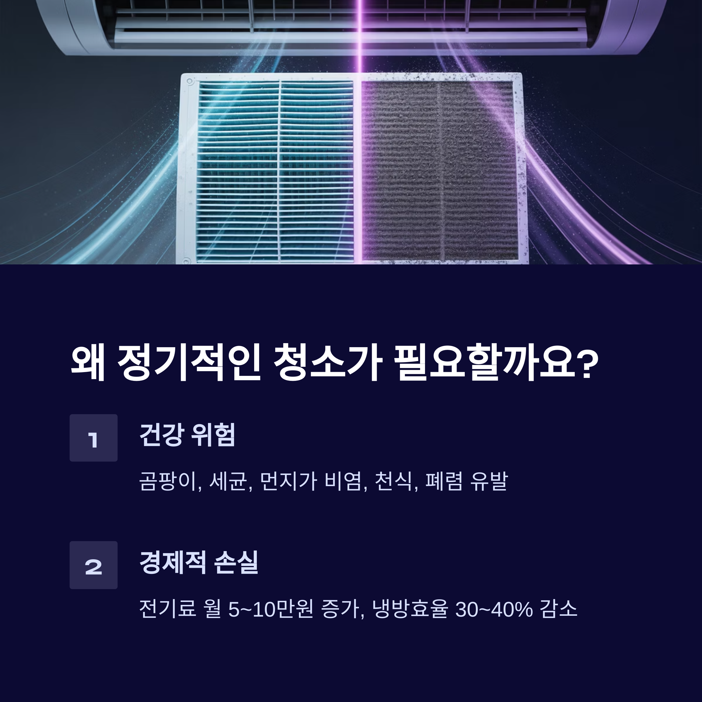 정기 청소만으로도 냉방 효과 40% 향상, 전력 소모 30% 감소가 가능합니다.