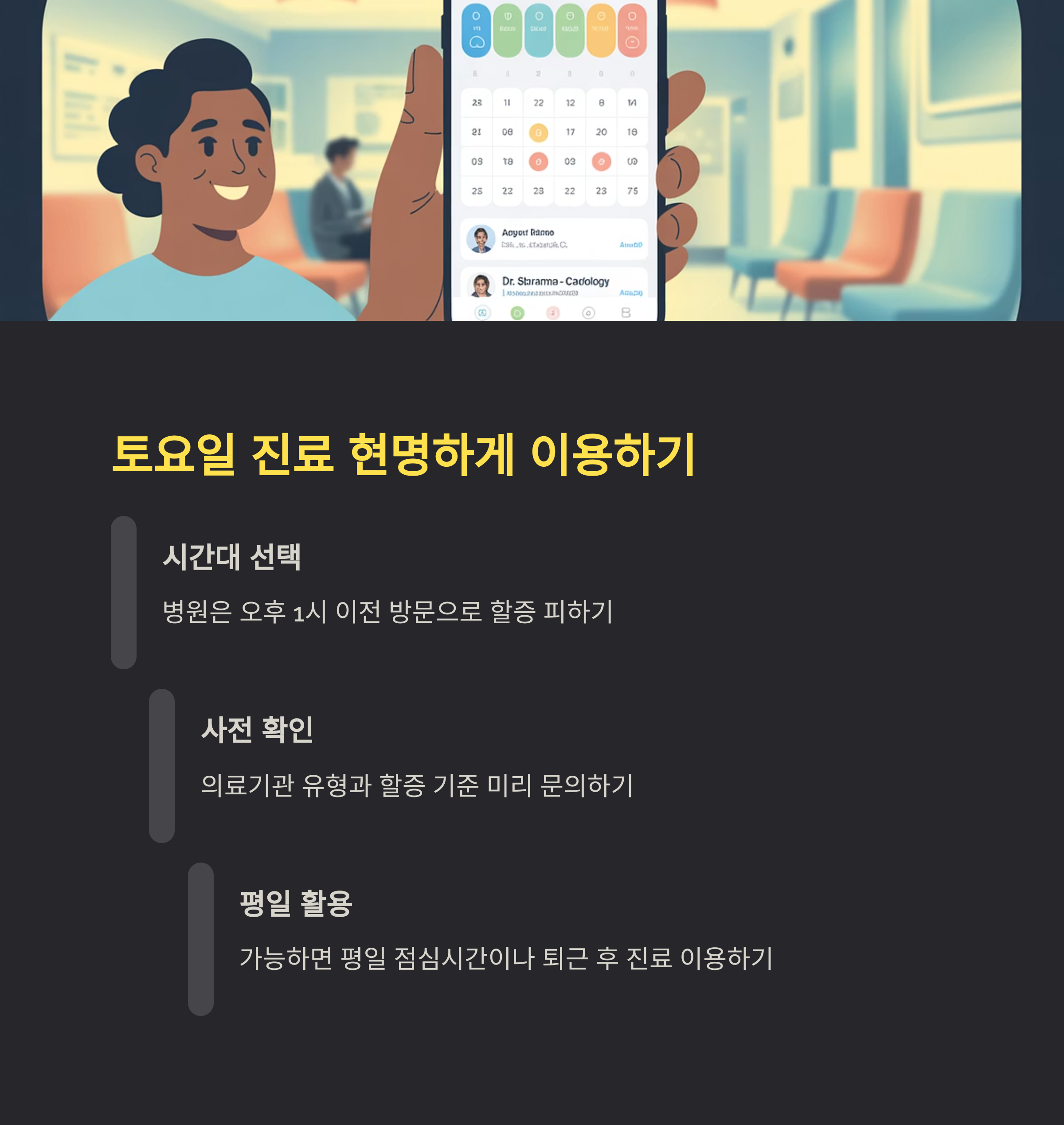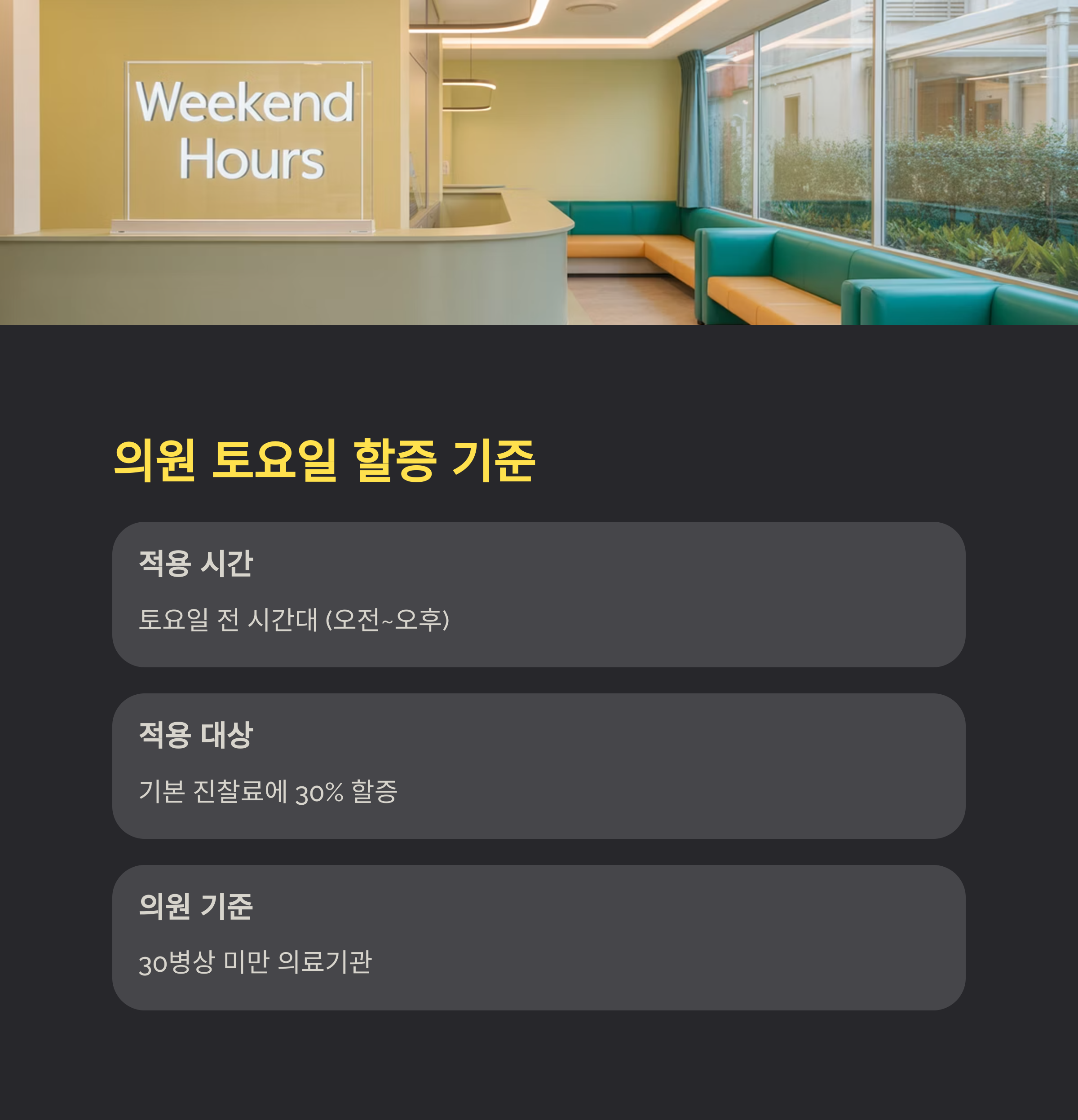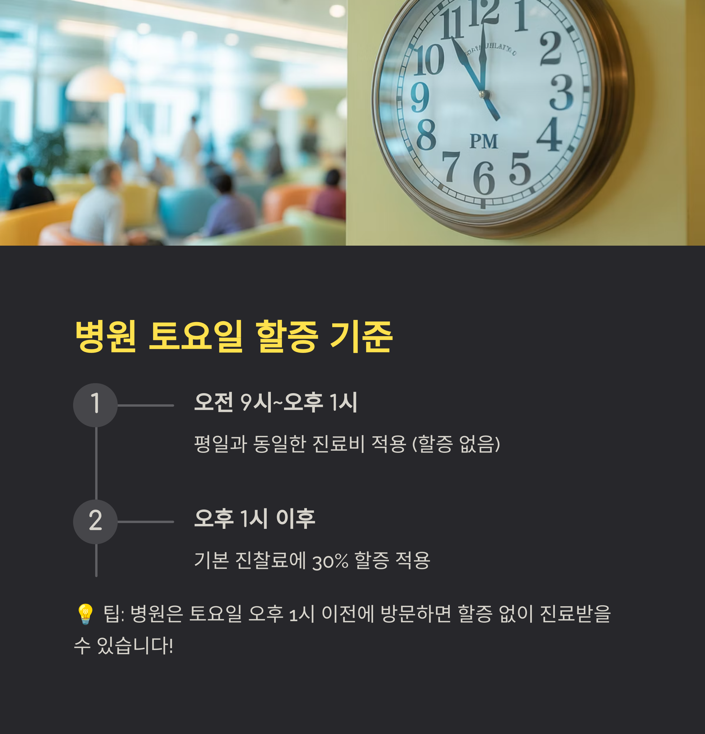 - 팁: 토요일에 병원 방문을 계획한다면, 가능한 오후 1시 이전에 방문하는 것이 진료비 절감에 도움이 됩니다.