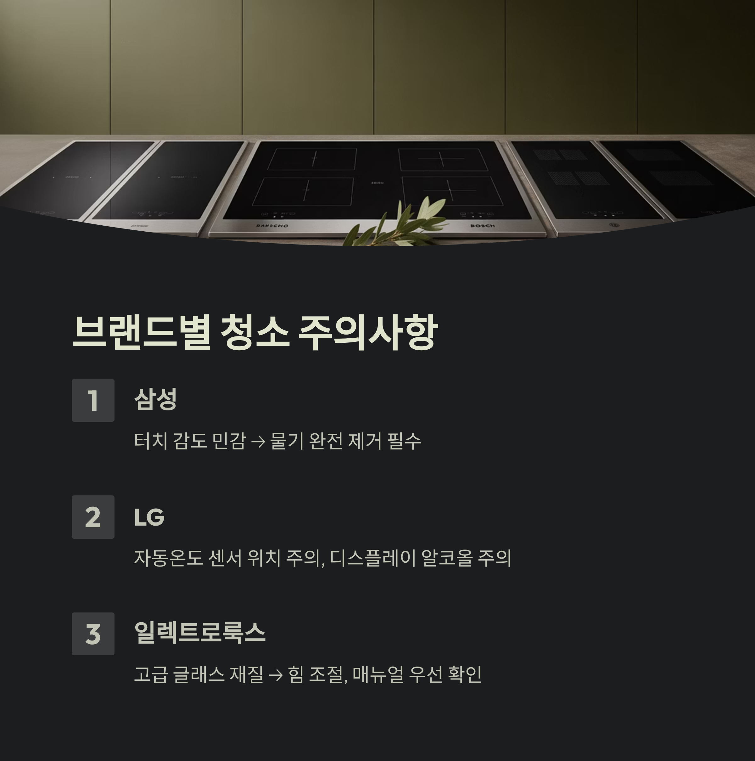 브랜드마다 센서 위치, 터치 방식, 유리소재가 달라 청소 포인트가 다릅니다.