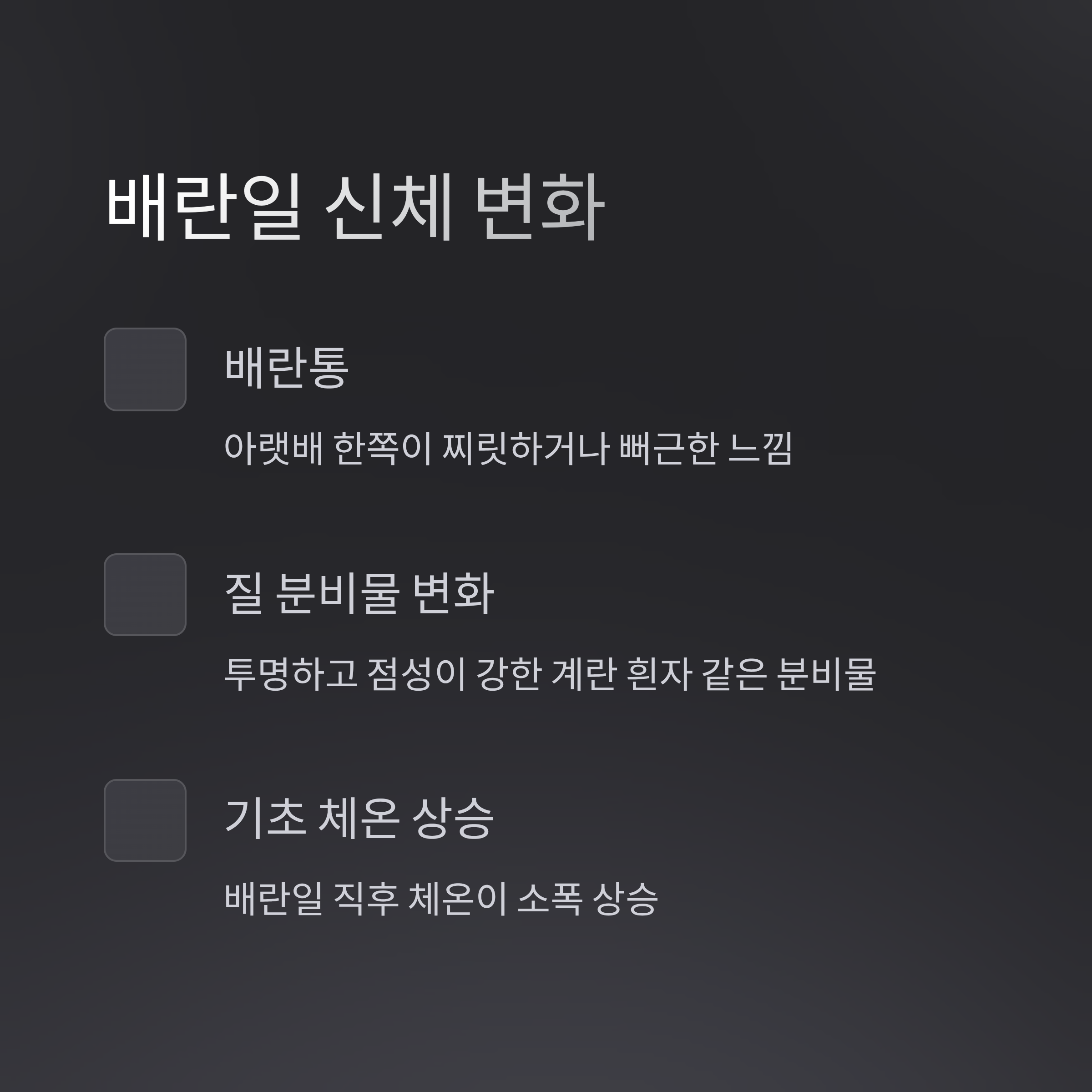 배란일이 가까워지면 몸은 자연스럽게 다양한 변화를 통해 신호를 보냅니다. 대표적인 증상은 아래와 같습니다.