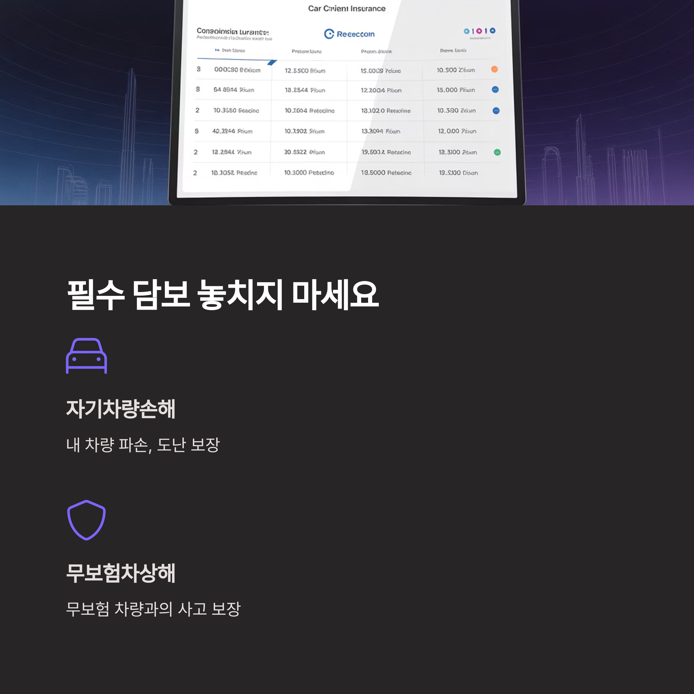 - 무보험차상해 담보: 보험에 가입되지 않은 차량과의 사고로 인해 발생하는 본인 및 가족의 피해를 보장해 주는 중요한 담보입니다. 필수적으로 포함해야 합니다.
