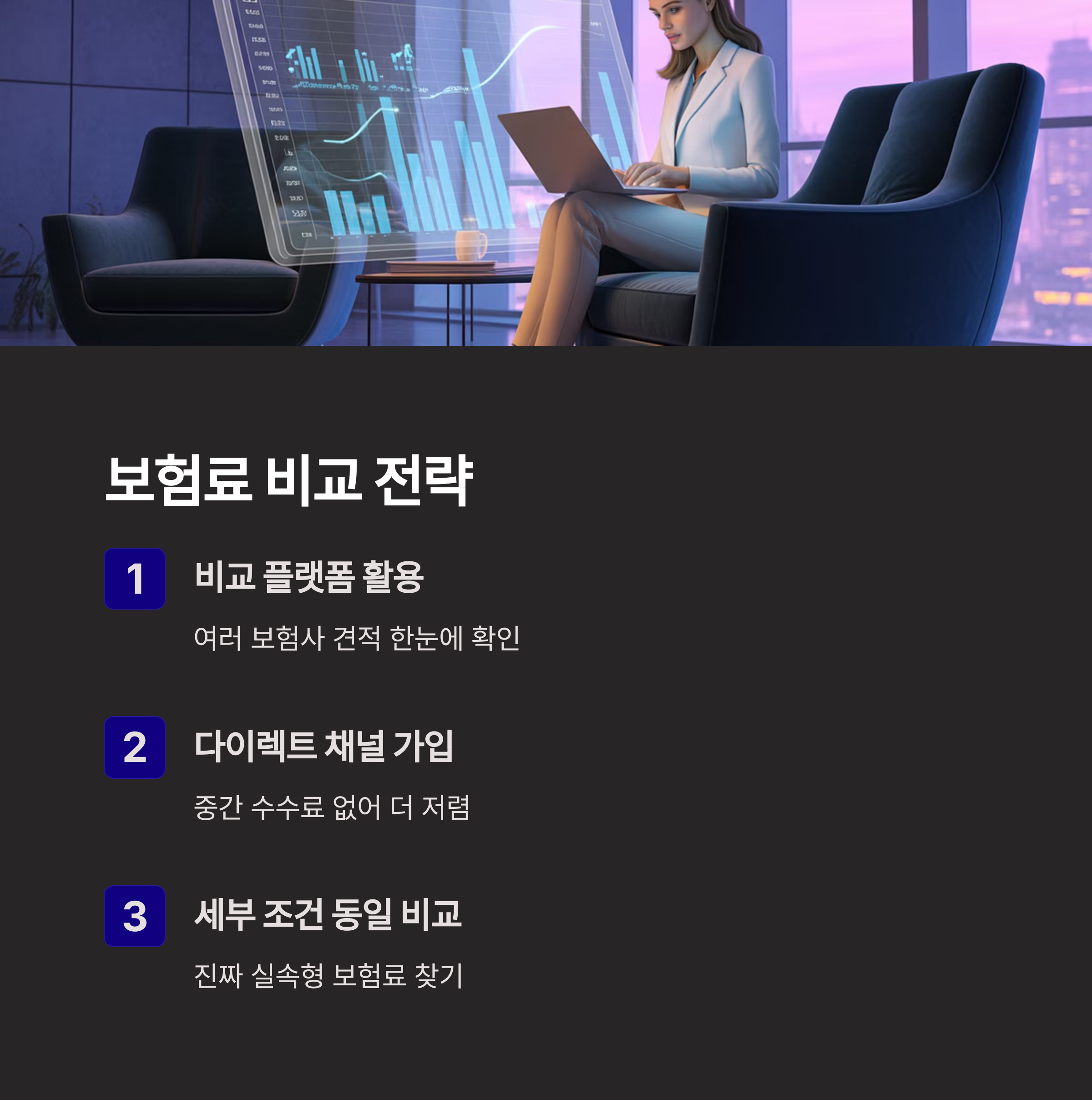 같은 차량, 같은 운전자 조건이라도 보험사마다 자동차보험료는 크게 달라질 수 있습니다. 효과적인 자동차보험 비교를 위해서는 다음 전략을 활용하세요.