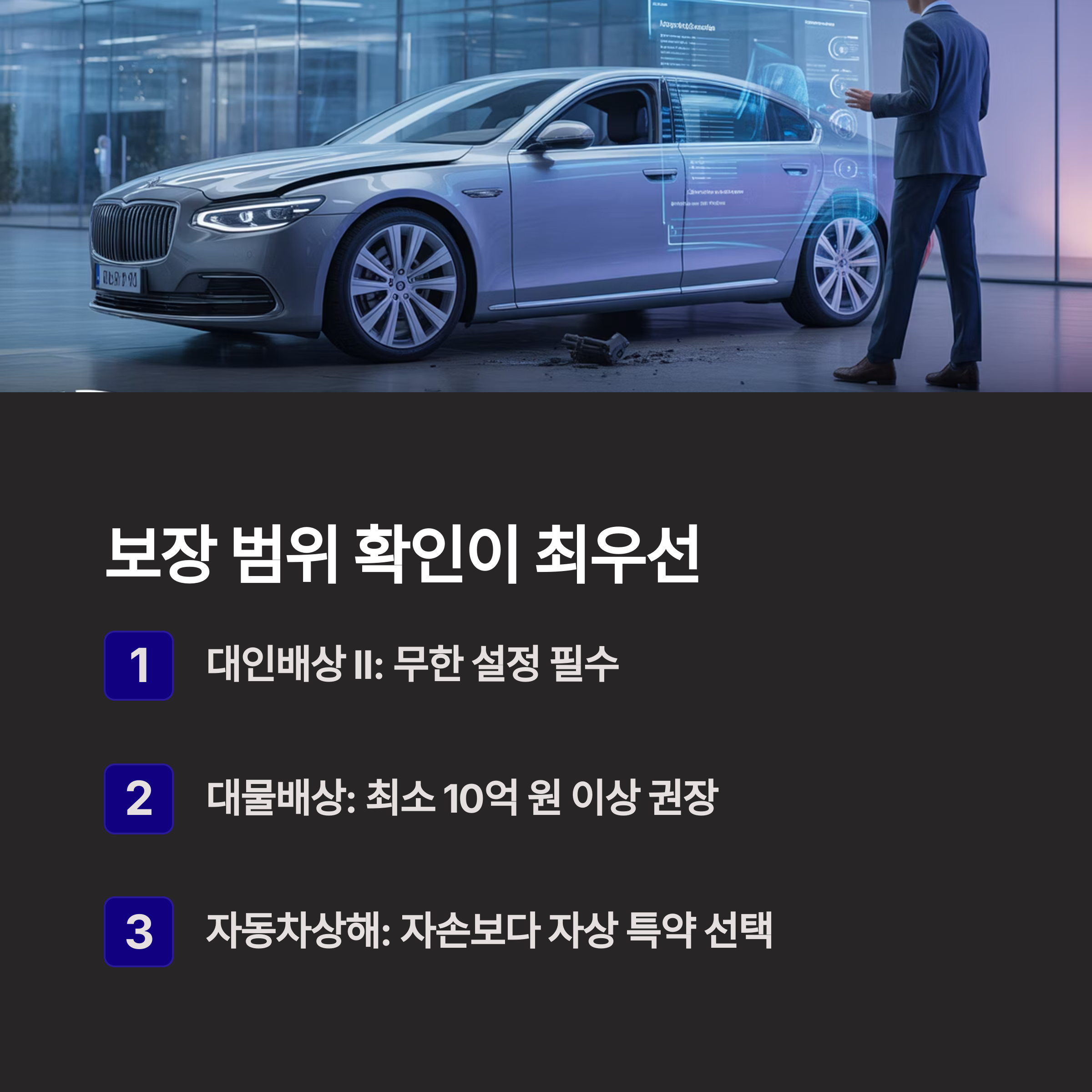 - 대물배상 10억 원 이상 권장: 최근 고가 차량이 많아지면서 사고 시 대물 피해액이 크게 발생할 수 있습니다. 최소 10억 원 이상으로 설정하는 것이 안전하며, 20억 원 이상을 고려하는 것도 좋습니다.
