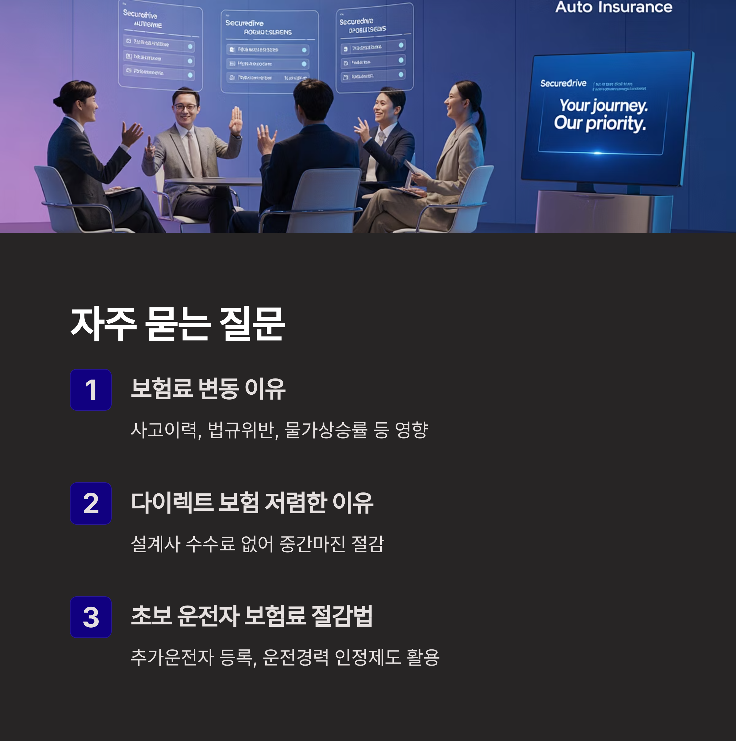 Q2: 다이렉트 자동차보험은 왜 더 저렴한가요? A2: 디렉트자동차보험은 설계사 수수료가 없어 중간 유통 마진이 절감되기 때문입니다. 고객이 직접 온라인으로 가입하므로 보험사 입장에서는 사업비가 절약됩니다.