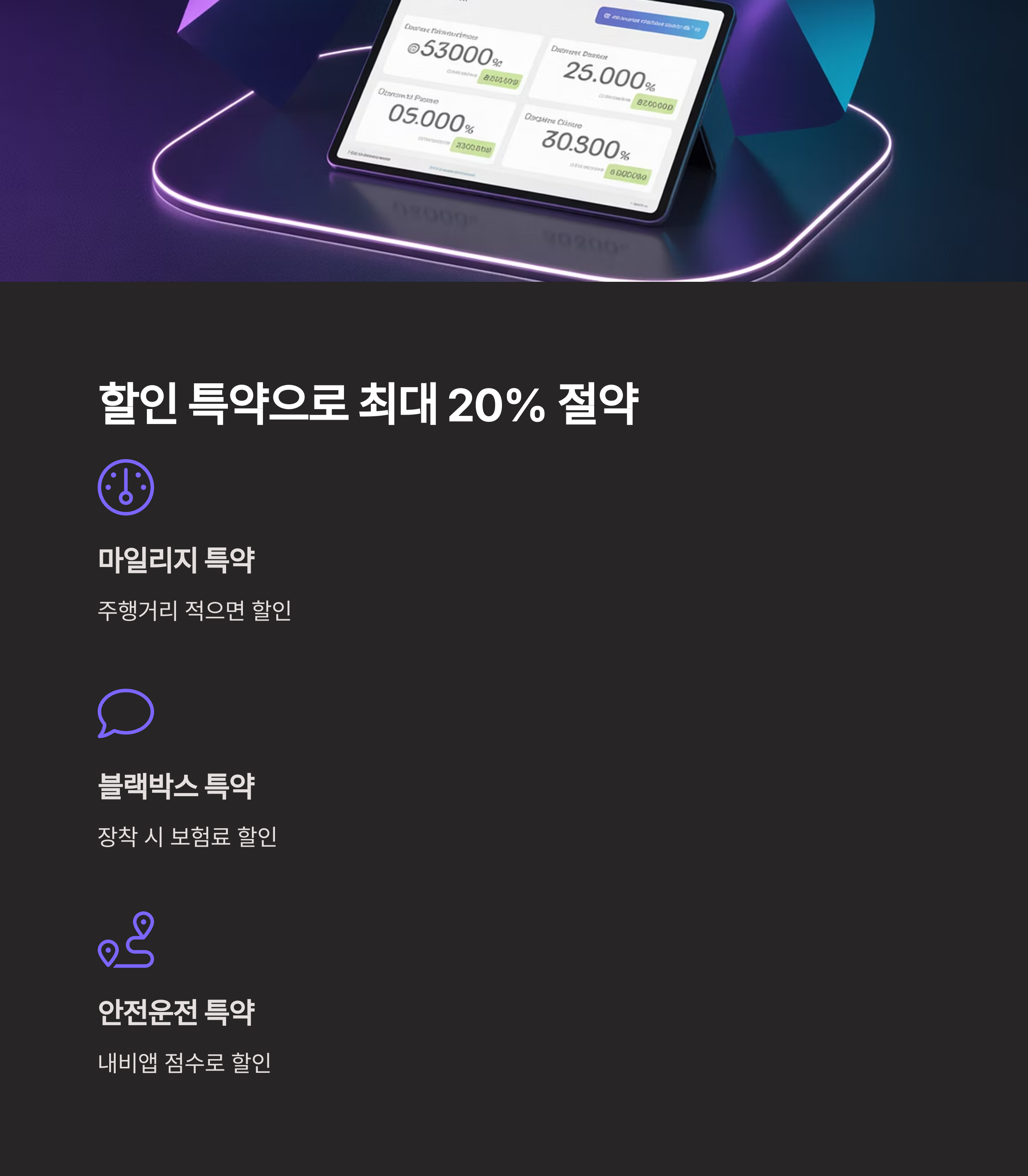 - 안전운전(UBI) 특약: TMAP, 카카오내비 등 내비게이션 앱의 안전운전 점수가 높거나, 실제 주행 데이터를 기반으로 운전 습관이 좋다고 평가되면 할인을 받을 수 있습니다. 평소 안전운전 습관이 있다면 큰 혜택을 볼 수 있습니다.