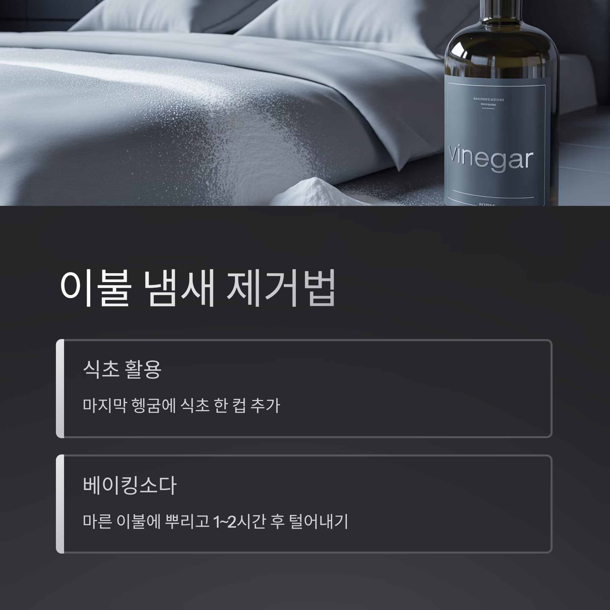 Q3: 이불에서 꿉꿉한 냄새가 계속 나는데, 어떻게 없앨 수 있을까요? A3: 세탁 시 마지막 헹굼 단계에 식초 한 컵을 넣거나, 마른 이불에 베이킹소다를 뿌려두었다가 털어내는 방법이 효과적입니다. 햇볕이 좋은 날 충분히 말려주는 것도 도움이 됩니다.