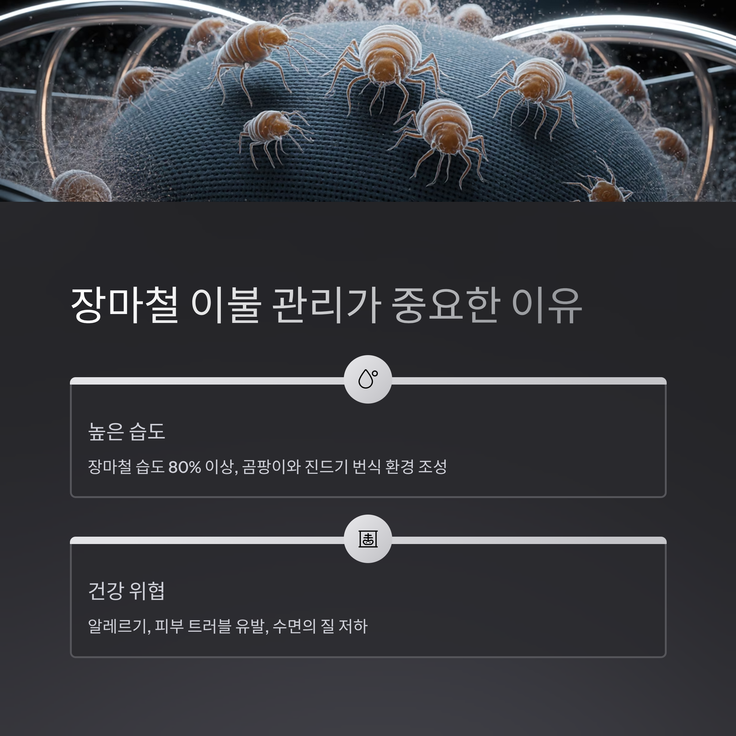 장마철 습도는 80%를 넘는 경우가 많아 이불속 곰팡이, 세균, 진드기 등이 번식하기 딱 좋은 환경이에요. 특히 아이가 있거나 반려동물을 함께 키우는 집이라면 이불 관리에 더욱 신경 써야 합니다. 이불이 눅눅하면 수면의 질이 떨어지고, 알레르기나 피부 트러블이 생기기도 해요. 따라서 이 시기엔 이불 세탁, 건조, 보관 모두 평소보다 더 꼼꼼히 챙겨주는 것이 좋습니다.