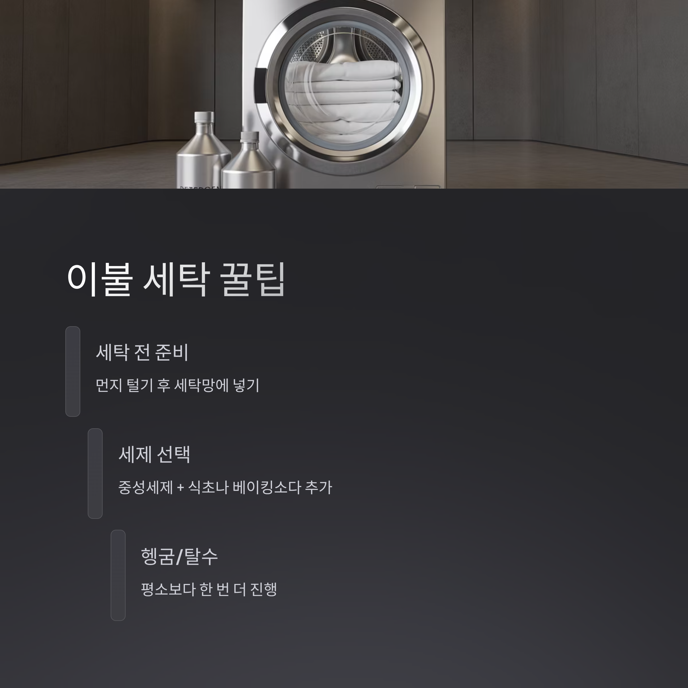 - 건조기 활용: 건조기를 사용할 땐 저온 모드나 이불 전용 코스를 사용하는 것이 좋습니다.