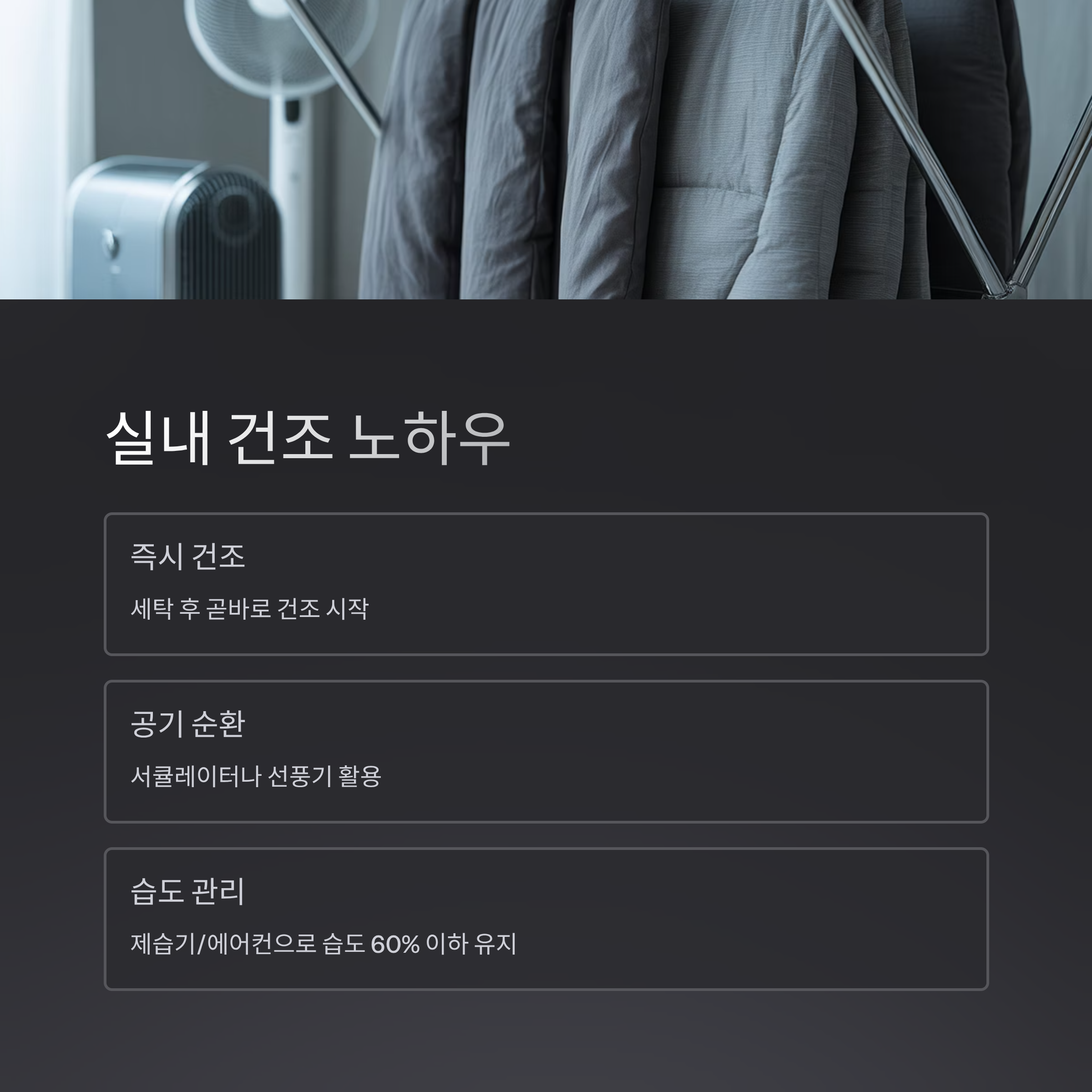 Q2: 건조기가 없다면 어떻게 이불을 말려야 하나요? A2: 실내에서 서큘레이터나 선풍기를 활용해 공기 순환을 돕고, 제습기나 에어컨을 함께 틀어 습도를 낮춰주세요. 겉이 마른 후에도 2~3시간 더 널어두어 속까지 완전히 말리는 것이 중요합니다.
