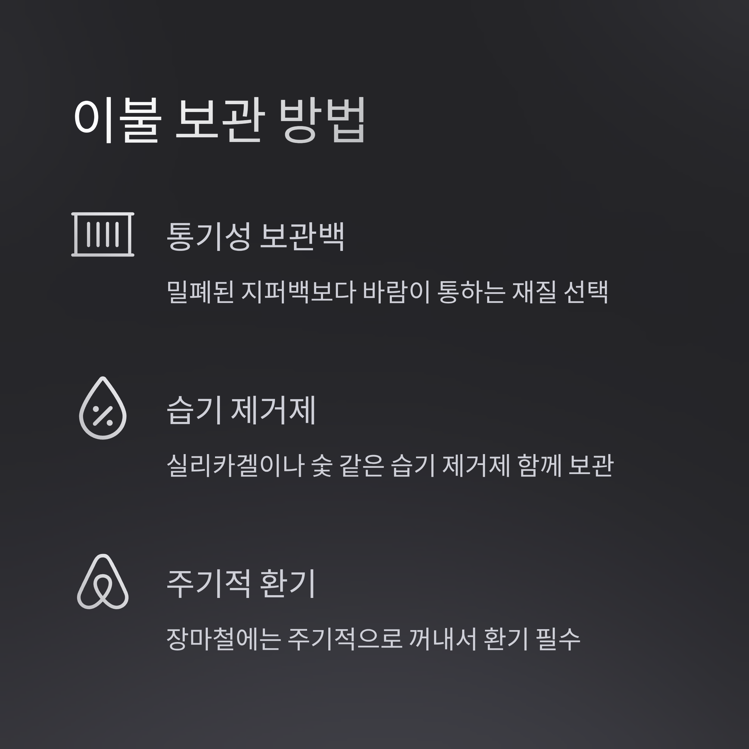 - 주기적인 환기: 장마철에는 주기적으로 꺼내서 환기해주는 것도 도움이 됩니다. 보관 상태가 좋지 않으면 다시 꺼냈을 때 냄새가 날 수 있으니 주의해야 해요.