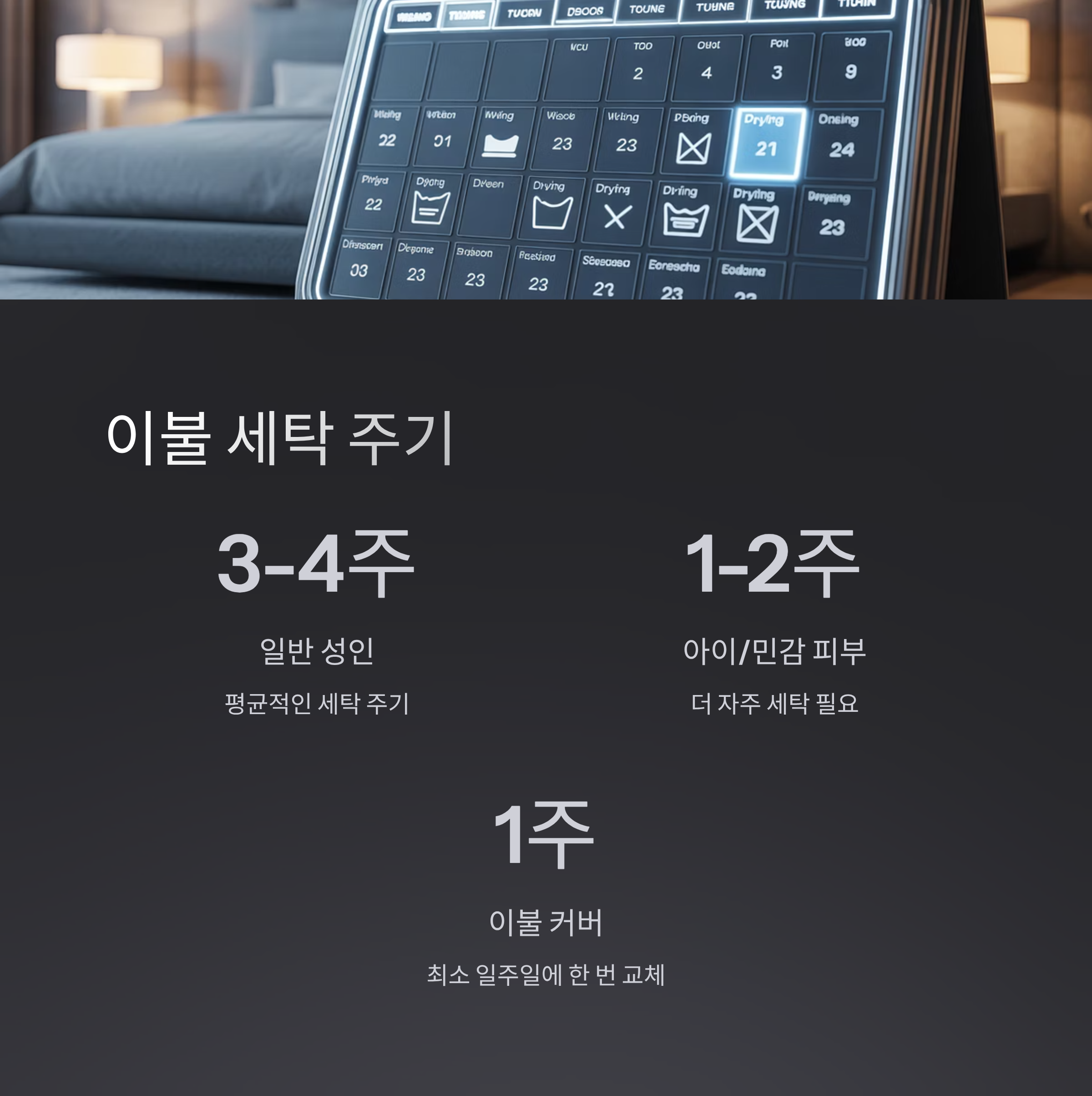 - 민감 피부/아기 이불: 특히 아기 이불은 주 1회 이상, 피부가 민감한 가족이 있다면 세탁 주기를 더 짧게 가져가는 것이 건강에 도움이 됩니다.