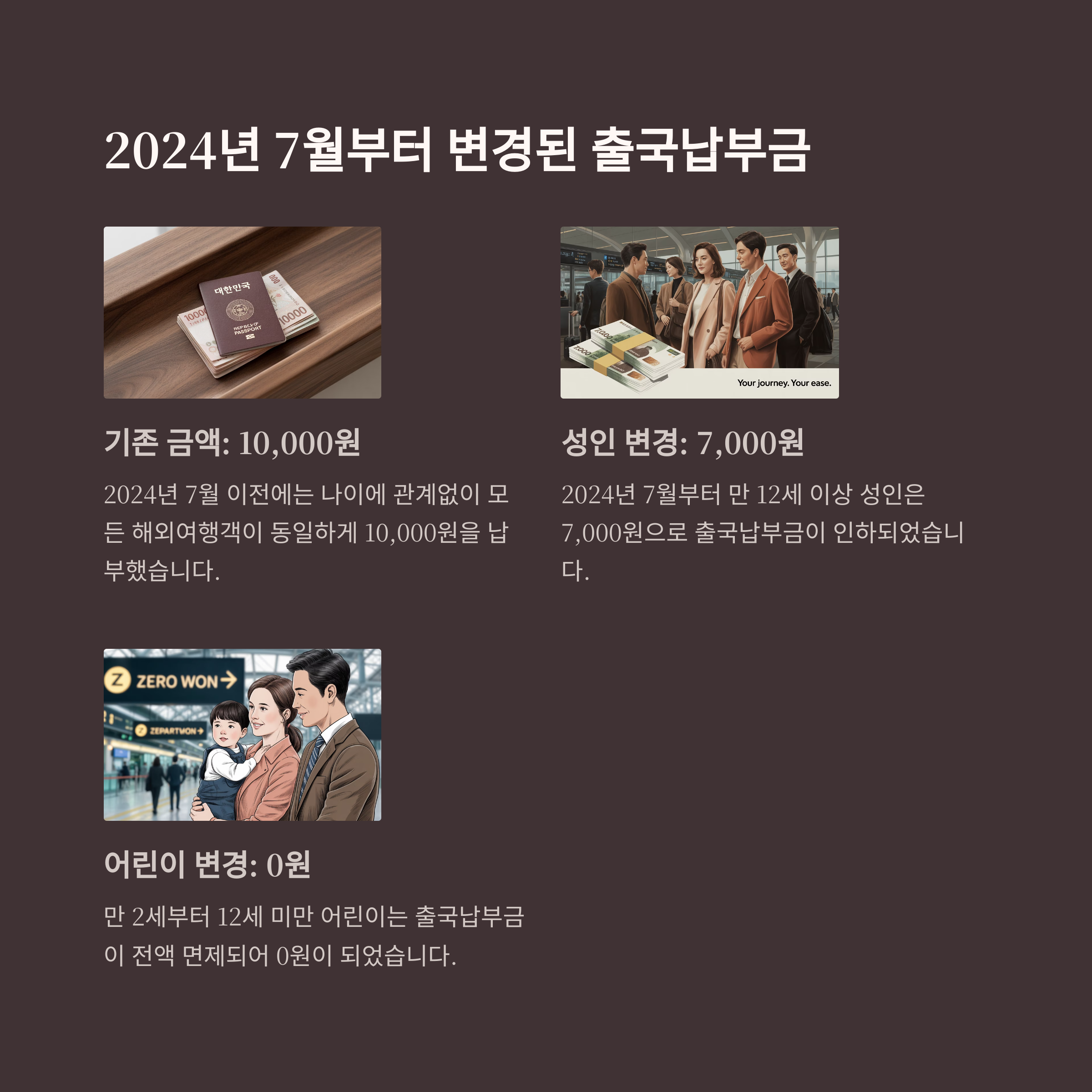 기존에는 모든 여행객이 10,000원을 납부했지만, 2024년 7월부터 성인은 7,000원으로 인하, 만 2세 이상 12세 미만 어린이는 전액 면제로 개정되었습니다. 이 변경으로 인해 출국납부금 환급 신청 방법에 대한 관심도 높아지고 있어요.