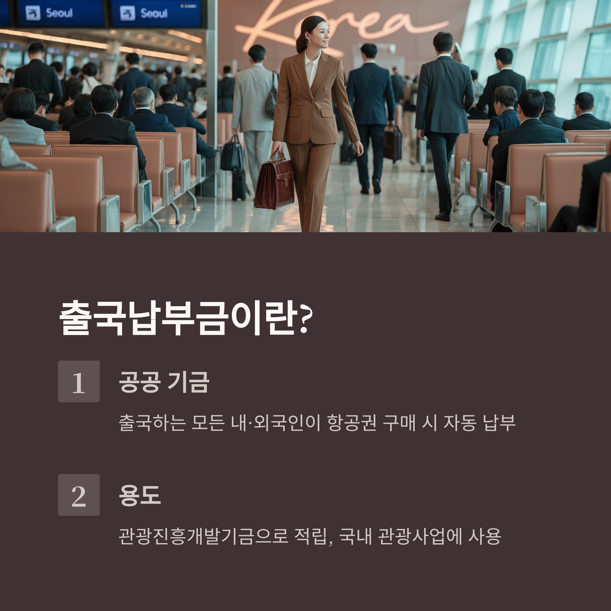 출국납부금은 우리나라를 출국하는 모든 내·외국인이 항공권 구매 시 자동 납부하는 공공 기금입니다. 이 비용은 관광진흥개발기금으로 적립되어 국내 관광사업에 사용됩니다.