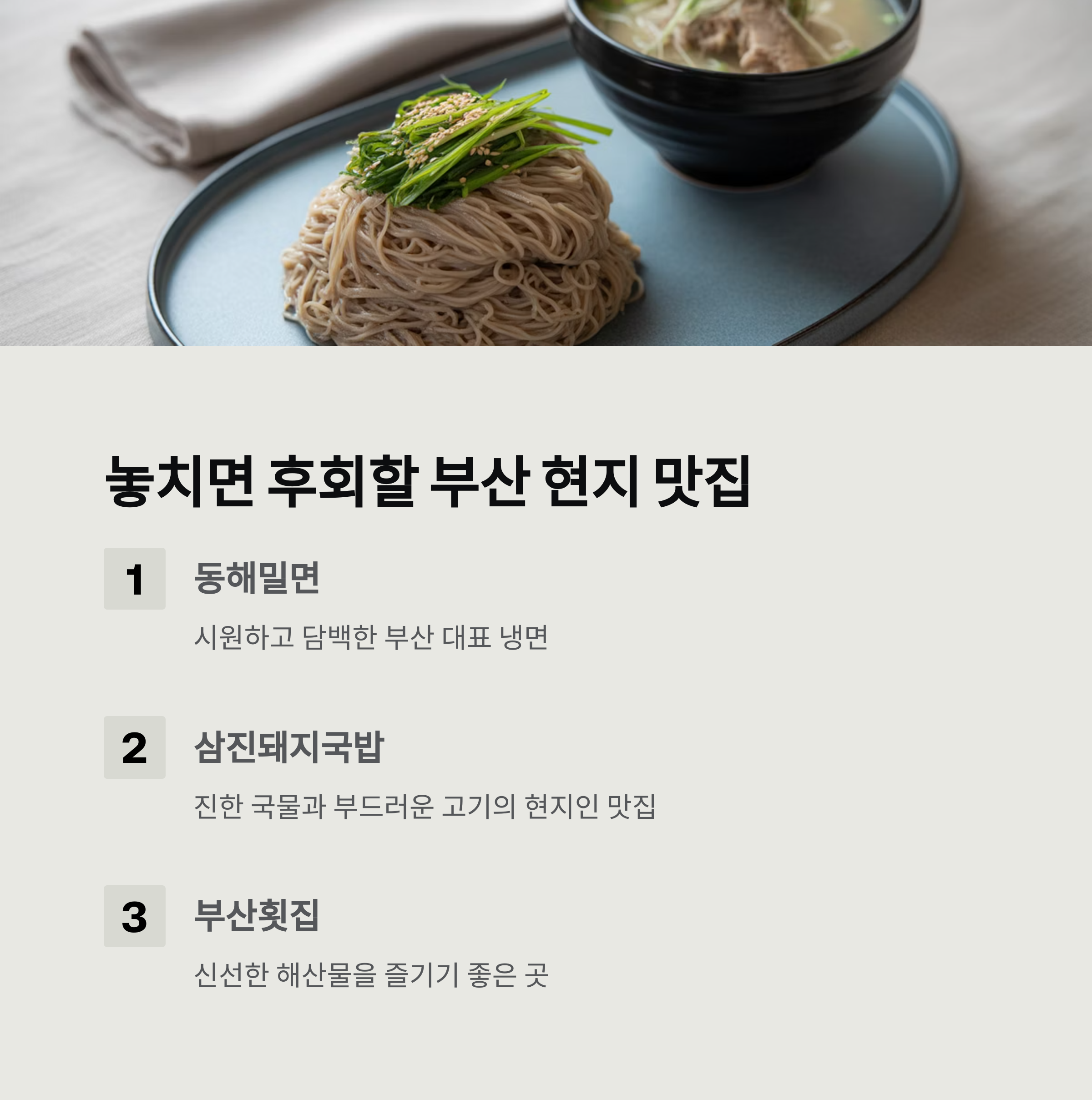 - 동해밀면: 부산 하면 빼놓을 수 없는 대표적인 냉면 맛집입니다. 시원하고 담백한 밀면은 더운 날씨에 특히 인기가 많습니다.