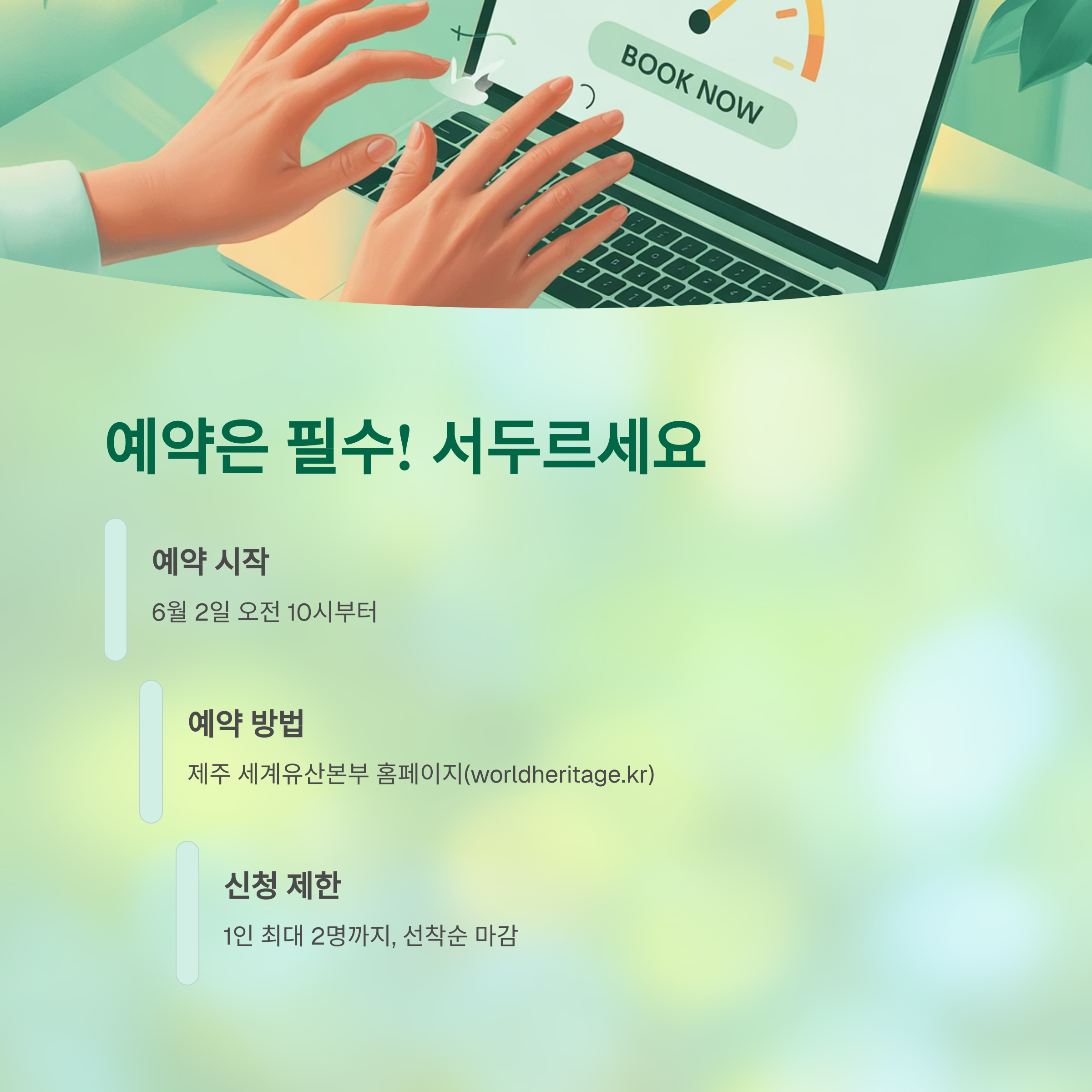 백록샘 탐방은 사전 예약이 필수입니다. 제주 세계유산본부 홈페이지(worldheritage.kr)에서 6월 2일(월) 오전 10시부터 예약이 시작되었으니, 서둘러 확인하고 예약하세요! 1인 최대 2명까지 신청 가능하며, 선착순 마감이니 사전 북마크와 개인정보 입력 준비가 성공 여부를 가릅니다.