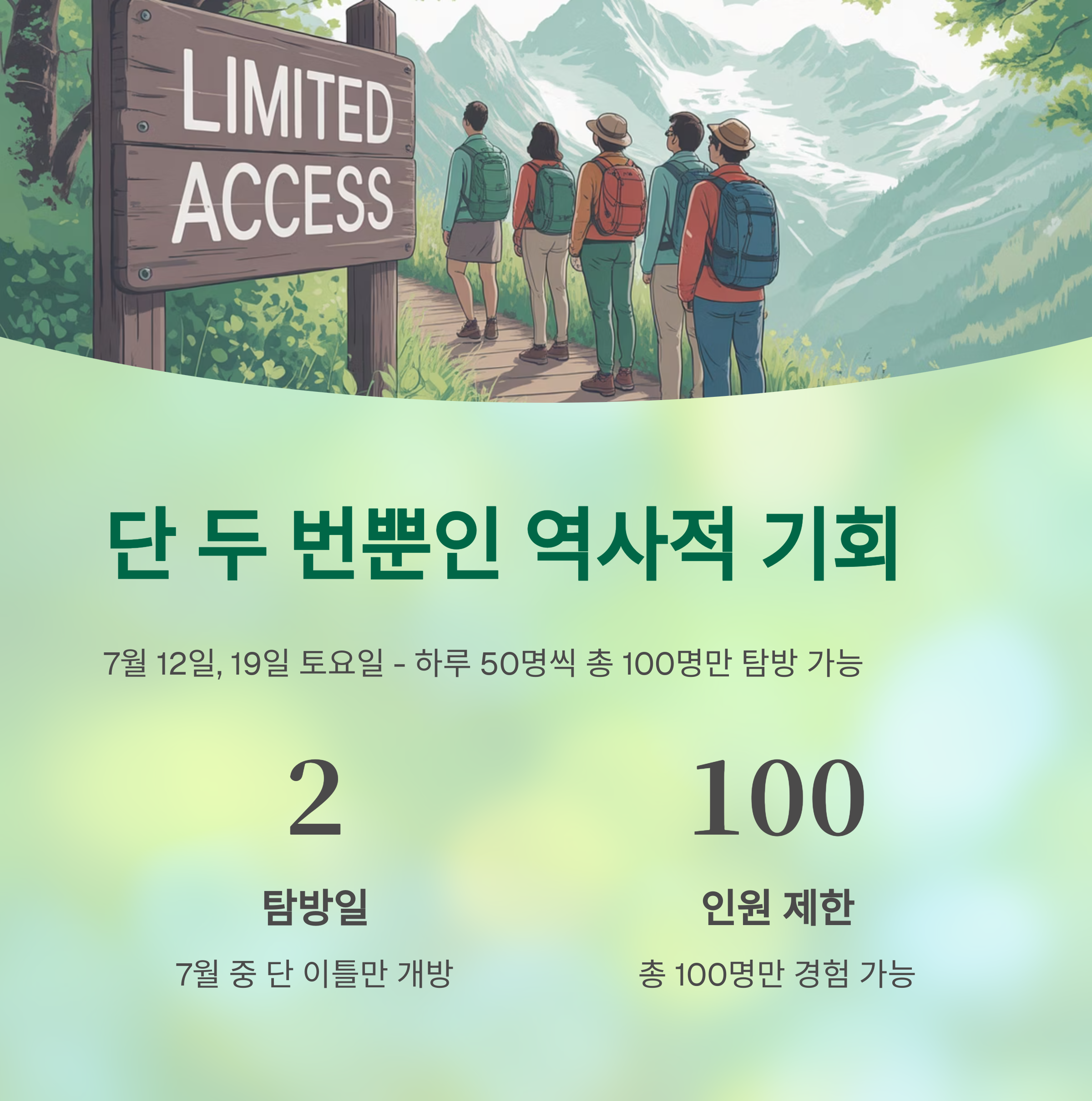 - 탐방 인원: 일일 50명 제한 (총 100명, 7월 12일, 7월 19일 양일간)