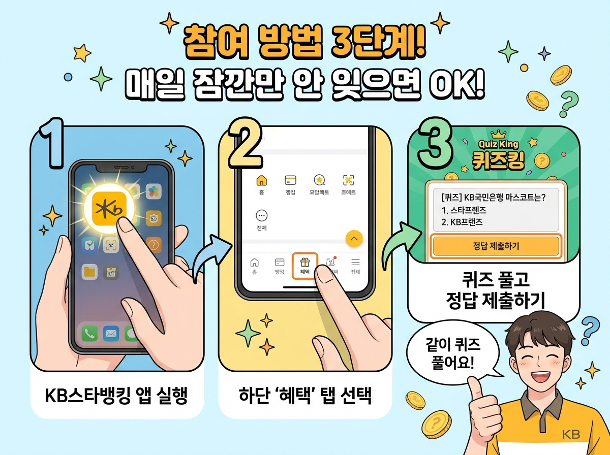 KB스타뱅킹 스타퀴즈에 참여하는 방법은 정말 간단해요. 앱을 실행하고 화면 하단에 있는 '혜택' 메뉴를 선택한 후, '오늘은 내가 퀴즈왕 퀴즈풀기'를 누르면 끝이에요.